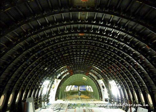 首個A350XWB前機(jī)身內(nèi)部構(gòu)造。前機(jī)身結(jié)構(gòu)采用碳纖維復(fù)合材料,正在法國圣納澤爾工廠進(jìn)行組裝。