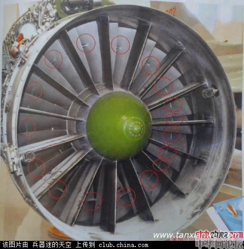 因此,有些風扇就在每個葉片的兩側(cè)加一個凸臺,專業(yè)術(shù)語稱為“凸肩”。建國60周年空軍成就展上披露,在殲11系列的AL31FN和WS-10A發(fā)動機進氣口,都有這樣的凸肩(見下圖)。這樣,葉片全部高速旋轉(zhuǎn)時,各凸肩形連起來成了一個加強環(huán),增加了葉片剛度。而且,葉片是依次疊加的,每個凸肩“頂”著前面一個葉片,有效降低了阻尼震顫。但這樣做的后果,是凸肩增加了葉片厚度和重量,同時增加了葉片數(shù)量,降低了發(fā)動機的推重比。