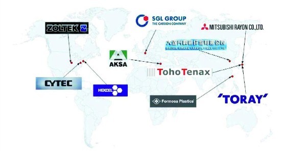 目前,世界碳纖維年產量約50000噸,PAN基碳纖維約占各種碳纖維材料的80%以上,其中日本東麗、東邦和三菱人造絲3家公司占據了70%以上,其余主要的生產商還有中國臺灣的臺塑公司、美國的Hexcel、Cytec、Zoltek公司,德國的SGL公司以及韓國的泰光產業(yè)公司等。