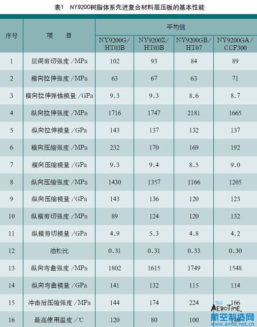 為提高和穩(wěn)定先進復合材料的成型質(zhì)量,降低先進復合材料的制造成本,我們根據(jù)不同的復合材料結構件研制開發(fā)了中高溫度固化、韌性不同的NY9200環(huán)氧樹脂體系,原材料均為國產(chǎn),價廉易購;其配制工藝簡單,質(zhì)量穩(wěn)定,可用于濕法或干法預浸,無污染,易工程化;其預浸料具有貯存期長,固化溫度帶寬,固化時間短等優(yōu)點;其先進復合材料具有韌性和機械性能兼優(yōu)的特性,完全可滿足使用溫度為80~130℃的國內(nèi)先進復合材料對樹脂基體的要求。其先進復合材料層壓板的基本性能如表1所示。