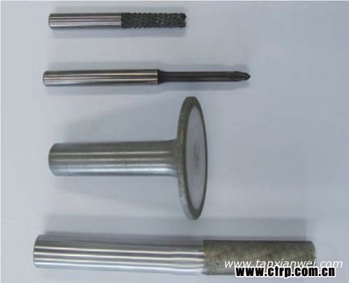 上面的兩個是通過CVD(化學(xué)氣相沉淀)涂布了金剛石的超硬合金立銑刀,屬于市售工具。下面兩個是電沉積了金剛石砂粒的工具,是在工具廠商協(xié)助下自制的工具。