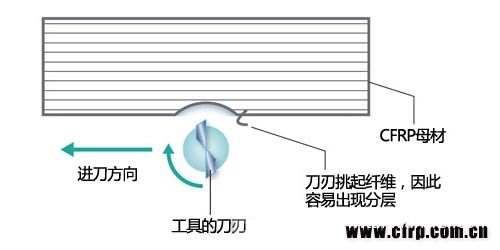 2]工具的旋轉(zhuǎn)和進(jìn)刀方面,加工CFRP特別需要注意的是工具的旋轉(zhuǎn)方向和進(jìn)刀方向。因?yàn)橛深A(yù)浸材層疊而成的CFRP具有各向異性。