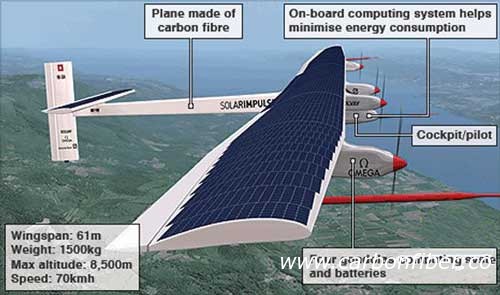 “陽光動力號”飛機原型的機翼類似空客A340,長63.4米,其上集成了200平方米的光伏電池面板,由12000塊厚度僅為180微米的單晶硅光伏電池板組成,晝夜均可飛行。飛機主架結(jié)構(gòu)采用含碳素纖維和蜂巢的復(fù)合材料,以三明治式夾層法壓制合成,機身僅重1500公斤,比傳統(tǒng)飛機輕1600公斤 “陽光動力號”于21日開始在瑞士東部迪本多爾夫進行模擬飛行。項目團隊聲稱,這次測試將由項目聯(lián)合創(chuàng)始人和飛行員來評估駕駛艙的配置和飛行數(shù)天對人體的影響。這架覆蓋著光伏電池、僅由太陽能提供動力的太陽能樣機曾于2011年年中在歐洲完成了一系列飛行,并且還在布魯塞爾和巴黎航空展上亮過相。