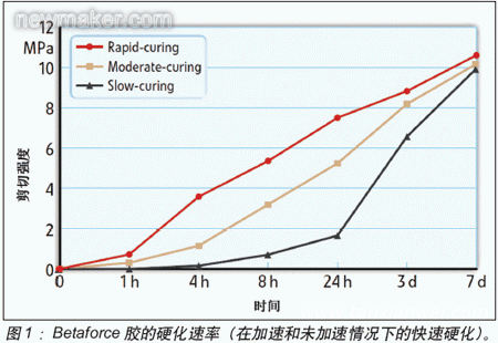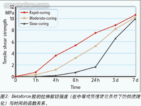 在標準氣候條件下,兩小時后沒有達到該拉伸剪切強度值。但是在加速條件下,1小時候即測得了達3.5MPa。樣本儲存于室溫條件下,強度僅為0.7 MPa。三天后,采用加速膠黏劑,達到了最終強度10.5MPa,而未經(jīng)加熱反應的樣本,在7天后方達到該強度。
