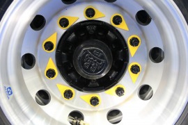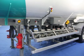 四軸鋁合金油罐半掛一下吸引住了小編的眼球,繞車一圈該車在設(shè)計上與國內(nèi)車型明顯不同,經(jīng)詢問該車主要出口馬來西亞,泰國等,還值得一提的是該車也配了輪胎緊固標。