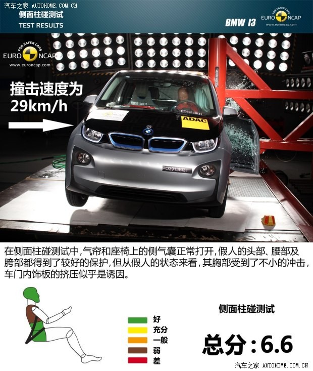 側面柱碰測試對于寶馬i3來說,不僅是檢驗車輛對駕駛員的保護能力,另一方面,車身結構對平鋪在車底的電池總成的保護也是一個考驗,但遺憾的是,E-NCAP的碰撞試驗沒有對此進行特別的說明,在未來,針對新能源汽車的碰撞測試中,這一環(huán)節(jié)是需要完善的。