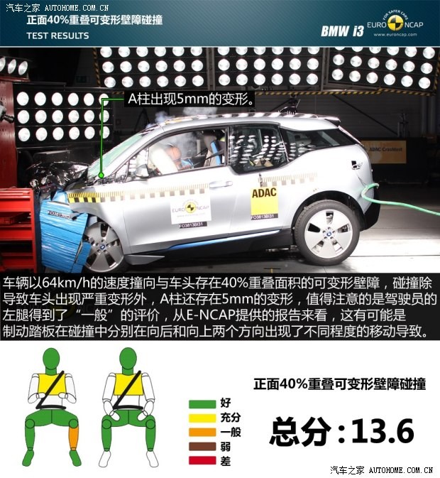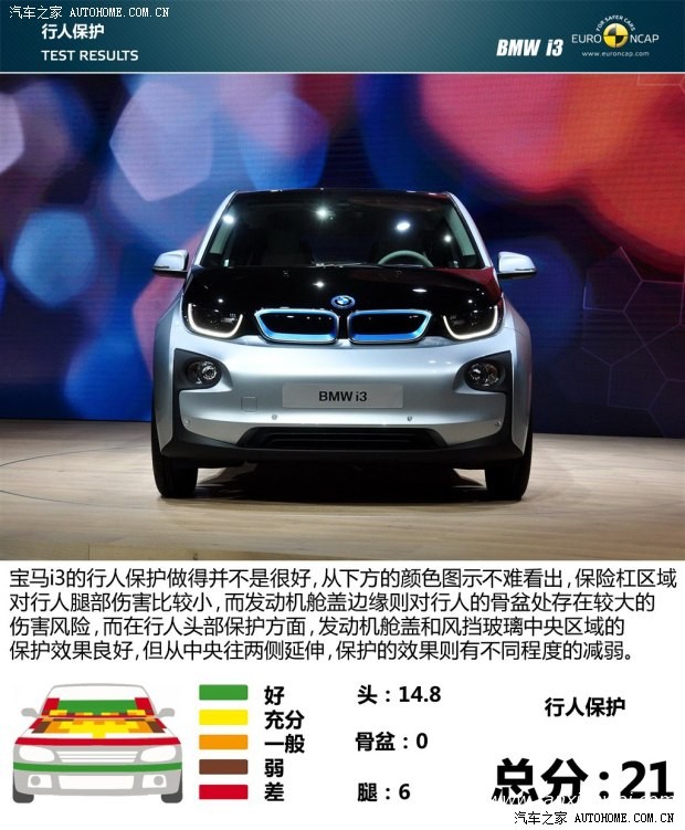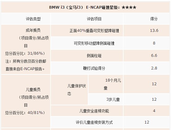 寶馬i3之所只拿到四星的成績,很大程度上都是因為這款車在行人保護和主動安全系統(tǒng)兩項評估失分較多,其中,行人保護測試中針對骨盆的評價和主動安全系統(tǒng)測試中有關速度輔助系統(tǒng)的評估都沒有得分,這導致兩項測試的得分均只拿到總分的一半。