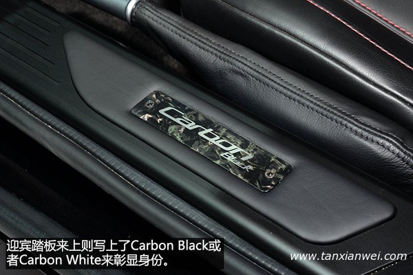 兩款車內(nèi)飾均采用了全黑設(shè)計(jì),并應(yīng)用一些紅色元素來與外觀的紅色制動(dòng)卡鉗進(jìn)行呼應(yīng),比如搶眼的紅色換擋撥片以及細(xì)膩的紅色針腳等等。迎賓踏板來上則寫上了Carbon Black或者Carbon White來彰顯身份。