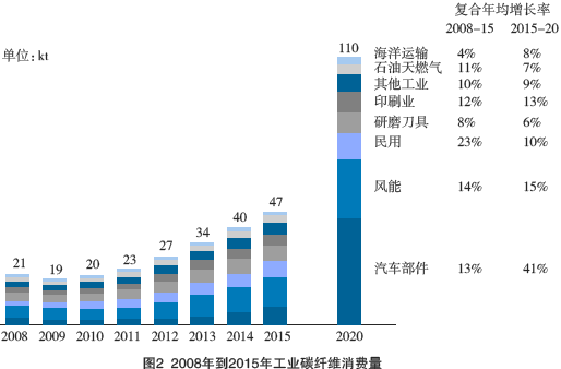 2010年,包括體育休閑和宇航在內(nèi)的工業(yè)應(yīng)用大約消耗了總產(chǎn)量31000t中的20000t,已占到碳纖維消費(fèi)量的2/3(見圖1)。到2015年,體育休閑消費(fèi)量將超過7000t/年,同時工業(yè)消費(fèi)量應(yīng)從20000t/年增長到47000t/年,到2020年,甚至達(dá)到110000t/年(見圖2)。從中期看,風(fēng)電葉片可能是碳纖維需求的主要動力,而從長期看,汽車行業(yè)將促進(jìn)碳纖維的需求。僅靠汽車行業(yè)就能改變碳纖維復(fù)合材料生產(chǎn)企業(yè)的面貌。 本文來自123