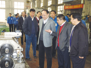 高勇深入邯鄲紡機(jī)機(jī)加工、總裝等分廠,現(xiàn)場考察企業(yè)的加工流程、技術(shù)能力、生產(chǎn)裝備。邯鄲紡機(jī)領(lǐng)導(dǎo)介紹了企業(yè)滌綸短纖后處理設(shè)備、粘膠纖維短纖維紡絲成套設(shè)備和長絲紡絲設(shè)備等三大類產(chǎn)品和近年來研發(fā)特種纖維設(shè)備的情況,匯報(bào)了公司的研發(fā)理念、研發(fā)成果、用戶使用情況、公司產(chǎn)品的市場占有率。高勇對邯鄲紡機(jī)碳纖維、芳綸等生產(chǎn)設(shè)備開發(fā)、市場投放給予高度的評價,認(rèn)為邯鄲紡機(jī)的產(chǎn)品市場定位準(zhǔn)確,有一定的市場份額。高勇指出邯鄲紡機(jī)在做好設(shè)備研發(fā)制造的基礎(chǔ)上,要抓住企業(yè)搬遷改制的契機(jī),在企業(yè)升級改造和做精工藝上下功夫。