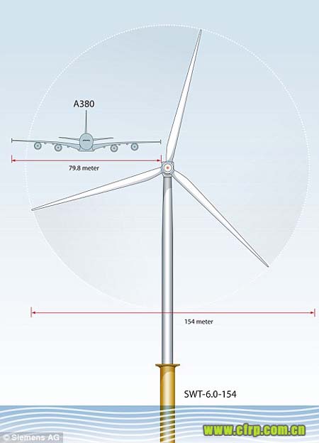 報(bào)道稱,這座目前世界上最大的風(fēng)車是由德國(guó)西門子公司開發(fā)的大型風(fēng)力發(fā)電機(jī),擁有三片長(zhǎng)度達(dá)到75米的扇葉,僅僅比空客公司的巨無霸客機(jī)A380的翼展(79.8米)略短。報(bào)道稱,這座大風(fēng)車將于2014年矗立在臨近英國(guó)埃塞克斯郡海岸的水中。
