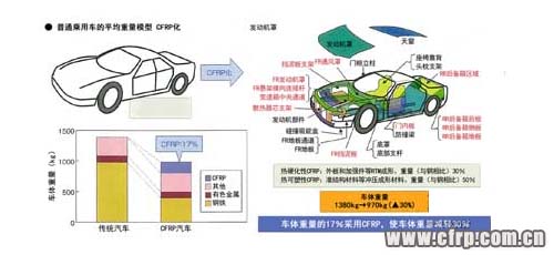 例如,按照碳纖維協(xié)會(huì)的推算,普通乘用車的平均車體重量為1380kg,如果盡可能采用CFRP部件,重量大約可以減輕30%,達(dá)到97Okg。CFRP的使用量占車體重量的17%左右,約為165kg,這樣一來(lái),如果10年的行駛距離為9.4萬(wàn)km,二氧化碳排放量可以減少5噸。