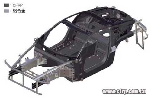 日本廠商方面,豐田的雷克薩斯LFA是首款CFRP車(chē)。該車(chē)最初采用鋁(Al)合金設(shè)計(jì),但中途改成了CFRP設(shè)計(jì),駕駛室由CFRP制成,底盤(pán)部分由鋁合金制成。白車(chē)身重量為193kg,比使用鋁合金時(shí)減輕了約100kg(圖10)。