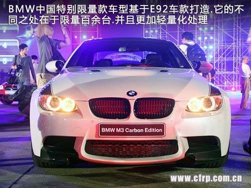 寶馬公司特別為中國提供111輛BMWM3碳纖限量版。除了裝備碳纖維車頂,還在前保險杠下面的裙邊、后擾流板以及內(nèi)飾等部位使用碳纖維材質(zhì),讓卓爾不群的M3更加珍貴而富有個性。