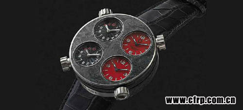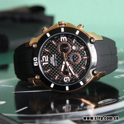碳纖維手表除了材質本身的魅力,在設計上也力求創(chuàng)意和精巧,將碳纖維優(yōu)勢由內而外地發(fā)揮出來。在《Style Carve》雜志推薦的十款性感的男士碳纖維腕表中,位列第一、最受青睞的就是 布雷博(Brembo)的Quattro Valvole CCM。碳纖維的黑色經典表面上,張揚的兩黑兩紅共四個小表盤非常醒目。設計的靈感來自于四氣門發(fā)動機的汽缸頭,在四個氣門的位置各自安裝了獨立的手表機芯。該款手表并不是布雷博自己推出的,而是聯(lián)合意大利著名手表廠商麥卡尼克·費洛奇(Meccaniche Veloci)共同推出的,亮相于2009 巴塞爾鐘表展上,售價為15000美元左右。這款表的顏色也做了大膽的嘗試,除黑色外,還有黃色、紅色和銀色。