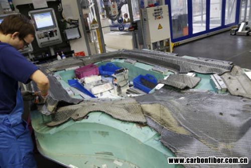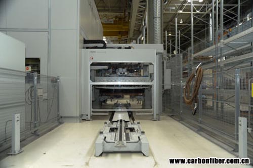 碳纖維材料被運(yùn)往寶馬在德國(guó)瓦爾斯多夫的零部件加工廠,然后根據(jù)需要紡織成各種各樣的結(jié)構(gòu)和樣式;再接著工作人員把這些半成品送往萊比錫和蘭茨胡特的碳纖維增強(qiáng)復(fù)合材料沖壓車(chē)間,完成碳纖維軟性板材(類(lèi)似坐墊、地毯)的制造。通過(guò)各種加工機(jī)械,碳纖維板材被切割成各種不同的大小和形狀,然后再利用熱處理或塑料粉末高壓粘合技術(shù),把這些板件加工出立體構(gòu)型。加工成型階段,每一次三個(gè)形狀完全相同的碳纖維板件要重疊在一起,這樣可以有效地降低在最終的樹(shù)脂傳遞成型過(guò)程中材料發(fā)生撕裂的可能性。