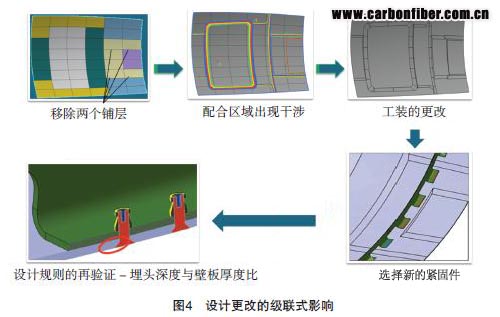 對于設(shè)計流程,設(shè)計更改是無處不在的,并且是一定會做設(shè)計更改的。那么設(shè)計更改的影響是什么呢?考慮機身壁板中蒙皮厚度變化和基礎(chǔ)結(jié)構(gòu)位置移動的連鎖影響。圖4說明的是由于簡單的鋪層的變化帶來的一系列的設(shè)計更改。