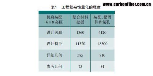 事實上,我們嘗試著量化大型航空結(jié)構(gòu)復(fù)合材料壁板的復(fù)雜性。舉個例子,對于一個由桁條和框分割的包含6×8 個島區(qū)的典型商用飛機的的航空壁板,得到如表1 所示的一組統(tǒng)計數(shù)字。創(chuàng)建了幾何參考并且保留在CAD 環(huán)境中。細(xì)節(jié)的幾何元素手動創(chuàng)建但沒有在三維CAD 環(huán)境中提交并確認(rèn)。除了幾何數(shù)據(jù),對于復(fù)合材料蒙皮有11320 個非幾何特征,對于裝配件、緊固件、孔等有48300 個非幾何特征。這些特征不屬于三維CAD 或者PLM 的一部分。另外,這些關(guān)系沒有在三維CAD 或者PLM 中捕獲,也沒有在設(shè)計意圖中體現(xiàn)。在CAD 和PLM 軟件中有超過90% 的數(shù)據(jù)沒有捕獲并且沒有有效管理。 本文來自123