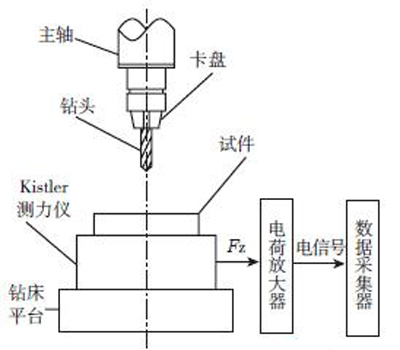鉆削碳纖維增強(qiáng)復(fù)合材料,一般采用高轉(zhuǎn)速和低進(jìn)給量。本試驗(yàn)采用高速臺(tái)鉆Z4006A,具有1370r/min、3700r/min、6900r/min、10000r/min 四級(jí)轉(zhuǎn)速,滿足鉆削時(shí)高轉(zhuǎn)速的要求。為了全面研究各類工藝參數(shù)對(duì)鉆削軸向力和制孔質(zhì)量的影響,作者對(duì)該鉆床進(jìn)行了改進(jìn)。在鉆床上加上步進(jìn)電機(jī)實(shí)現(xiàn)鉆床自動(dòng)進(jìn)給功能,進(jìn)給量可大范圍調(diào)整。圖5為碳纖維增強(qiáng)復(fù)合材料鉆削軸向力測(cè)量平臺(tái)示意圖。