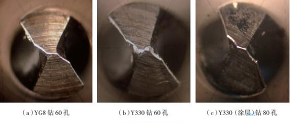 圖9為鉆削一定數(shù)量孔后3種鉆頭的磨損情況。從圖中可以看出,鉆削60孔后,Y330鉆頭磨損比較嚴(yán)重,YG8磨損量相對(duì)小些,Y330(涂層)鉆頭雖然所鉆孔數(shù)比較多(80孔),但磨損最小。