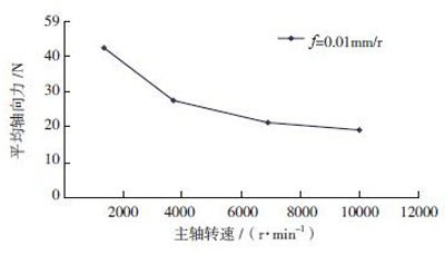 從圖中可以看出:軸向力隨著轉(zhuǎn)速的增加而呈現(xiàn)減小的趨勢(shì),曲線的曲率隨著轉(zhuǎn)速的增加逐漸減小,在轉(zhuǎn)速超過6000r/min 后,曲線已經(jīng)變得很平緩。由于切削熱的存在,轉(zhuǎn)速越高,鉆削溫度越高,且高速下,對(duì)鉆床剛度要求也高。因此,轉(zhuǎn)速不宜太高,建議轉(zhuǎn)速取在3000~6000r/min范圍內(nèi),對(duì)于剛度好的機(jī)床,可以適當(dāng)提高轉(zhuǎn)速;對(duì)于剛度差的機(jī)床,可以適當(dāng)降低轉(zhuǎn)速。