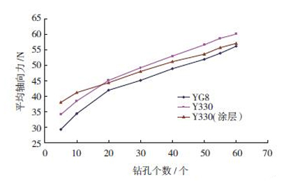 隨著鉆孔數(shù)的增加,3種鉆頭的軸向力逐漸增大。這是因?yàn)殡S著鉆孔數(shù)的增加,鉆頭磨損量增大,從而導(dǎo)致軸向力增大。比較有涂層的和無(wú)涂層的Y330鉆頭的鉆削前20個(gè)孔的平均軸向力,Y330(涂層)平均軸向力略大于Y330。這是因?yàn)椋和繉又?,刀具切削刃變鈍。但在鉆過一定孔數(shù)量(20孔)之后,Y330(涂層)平均軸向力小于Y330,說(shuō)明涂層材質(zhì)很好的提高了刀具的耐磨性。 123456