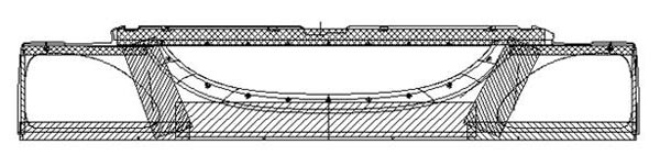 通過(guò)引入計(jì)算機(jī)模擬這一過(guò)程將使材料的流動(dòng)方向和流動(dòng)時(shí)間可視化,從而指導(dǎo)鋪層設(shè)計(jì),確定前期對(duì)產(chǎn)品的工藝設(shè)計(jì)的方向,其基本的原理為:設(shè)SMC模壓流動(dòng)時(shí)為不可壓縮的流體,結(jié)合動(dòng)量、能量、質(zhì)量守恒方程,得到SMC模壓流動(dòng)的控制方程。其控制方程包括壓力分布方程、熱傳導(dǎo)方程和固化反應(yīng)動(dòng)力學(xué)方程等。對(duì)于薄殼件流動(dòng),如果假設(shè)模具表面沒(méi)有滑移;流動(dòng)中的主應(yīng)力是剪應(yīng)力。