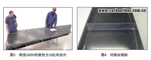 熱塑性復(fù)合材料主結(jié)構(gòu)件是一個(gè)過去即有涉獵的領(lǐng)域。灣流G550和G650 飛機(jī)的壓力艙壁板(圖2)是一系列帶壓力成型加強(qiáng)肋的碳/聚醚酰亞胺??湛虯400M 的駕駛艙地板就是用熱塑性復(fù)合材料制造的。最近,已經(jīng)著手焊接主操縱面。新型灣流G650 公務(wù)機(jī)(JEC2010 創(chuàng)新獎(jiǎng)得主)的方向舵和升降舵就是感應(yīng)焊接的多肋扭力盒結(jié)構(gòu)(圖3)。