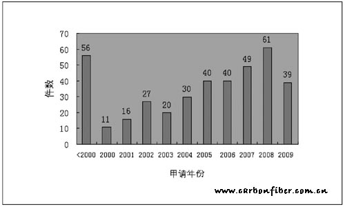 圖1 2009年以前我國(guó)碳纖維專(zhuān)利申請(qǐng)情況