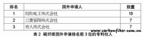 與之相反的是,國(guó)外申請(qǐng)人中位于前三位的均為日本企業(yè),大型纖維、化工企業(yè)是碳纖維研究進(jìn)展的主導(dǎo)力量。目前,在碳纖維領(lǐng)域,日本企業(yè)占有市場(chǎng)份額最大,關(guān)鍵技術(shù)主要掌握在東麗公司、東邦Tenax集團(tuán)和三菱人造絲集團(tuán)手中,其他碳纖維企業(yè)多處于成長(zhǎng)階段,生產(chǎn)工藝正在摸索中不斷完善。從專(zhuān)利申請(qǐng)數(shù)量上看,以昭和電工株式會(huì)社最多(Showa Denko)(見(jiàn)表2)。