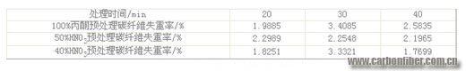 采用經(jīng)過(guò)100%丙酮、50% HNO3、40%HNO3浸泡120分鐘的碳纖維,在過(guò)磷酸銨配制的溶液中進(jìn)行處理。處理后碳纖維的失重率見(jiàn)表4。