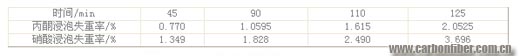 采用60%丙酮、100%硝酸作為溶劑進(jìn)行浸泡,不同浸泡時(shí)間下,碳纖維浸泡后的失重率見(jiàn)表3。