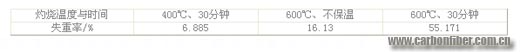 采用在空氣中進(jìn)行灼燒的方法,分別在400℃保溫30分鐘,升溫至600℃不保溫和升溫至600℃保溫30分鐘。碳纖維失重率見(jiàn)表4。