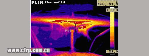 但是這是在沖擊發(fā)生后用10-15秒的紅外照相機(jī)拍攝到的照片;溫度等級(jí)圖表明洞四周的部分溫度已經(jīng)超過153°C,洞中間的碳纖維仍然在燃燒。