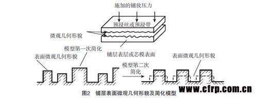 鋪層間緊密接觸度被定義為:在任意給定時間,兩鋪層接觸面積占鋪層面積總面積的百分比,與溫度、壓力、接觸時間有關[17]。由于表面粗糙度的原因,預浸絲或預浸帶表面與鋪層表面(或芯模表面)的微觀幾何形貌為不規(guī)則體,在未加熱和未施加壓力的條件下,預浸絲或預浸帶表面與鋪層表面(或芯模表面)不可能完全接觸。為理論計算方便,國外研究人員首先將不規(guī)則的微觀幾何體簡化成大小不同的矩形(指截面),然后再將上述矩形簡化成大小相同的矩形[18-20]。纖維鋪放過程中,在加熱到一定溫度時,當壓輥對預浸絲或預浸帶施加一定的鋪放壓力后,預浸絲或預浸帶與鋪層表面(或芯模表面)的突起的矩形將發(fā)生變形,矩形高度將減小,寬度將增大,然后根據(jù)這一模型,建立計算鋪放壓力與鋪層間緊密接觸度之間的函數(shù)關系。將現(xiàn)行的粗糙度評價指標融入上述計算模型中,可顯著提高實際應用的方便程度。圖2為鋪層表面微觀幾何形貌及簡化模型示意圖。