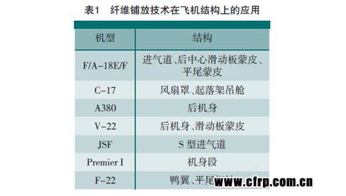 自動纖維鋪放技術是飛機復合材料構件自動化成型的關鍵制造技術之一,其又可細分為自動纖維絲鋪放技術和自動纖維帶鋪放技術。前者適用于平面型或低曲率的曲面型,或者說準平面型復合材料構件的鋪層制造;后者綜合了自動纖維纏繞與自動纖維帶鋪放兩者的優(yōu)點,可實現(xiàn)復雜曲面型復合材料構件的鋪層制造。表1中列出了纖維鋪放技術在飛機結構上的應用情況[1]。