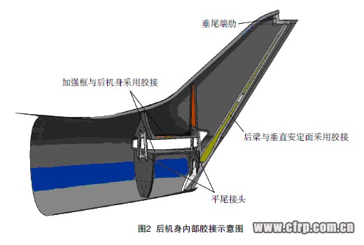 (1)后機(jī)身內(nèi)有兩個(gè)加強(qiáng)框,由上下兩個(gè)碳纖維復(fù)合材料件與蒙皮及垂直安定面后梁膠接組成,垂直安定面內(nèi)部有一個(gè)翼梁,采用碳纖維復(fù)合材料蜂窩夾層結(jié)構(gòu),采用膠接與蒙皮連接,如圖1、圖2所示。