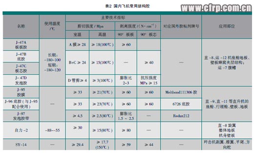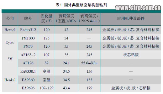 表1、表2分別列出幾種典型國內(nèi)外復(fù)合材料膠粘劑及其基本性能。