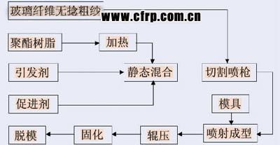 圖4所示為噴射成型工藝(Spray Up Molding)示意圖。該工藝是將混有引發(fā)劑和促進(jìn)劑的兩種聚酯分別從噴槍兩側(cè)噴出,同時(shí)將切斷的玻纖無(wú)捻粗紗由噴槍中心噴出,使其與樹(shù)脂在空間均勻混合后沉積到模具上。當(dāng)沉積到一定厚度時(shí),用壓輥滾壓使纖維浸透樹(shù)脂,排除氣泡,在經(jīng)常溫固化后成型為汽車(chē)復(fù)合材料制品。噴射成型工藝是在手糊成型工藝的基礎(chǔ)上發(fā)展起來(lái)的。由于該工藝是借助于機(jī)械的手工操作工藝,因此也被稱(chēng)為“半機(jī)械手糊成型工藝” 。圖5所示為該工藝的工藝流程。