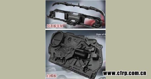目前,LFT工藝已在汽車防撞梁、前端模塊、儀表盤骨架、車門中間承載板、電瓶箱、座椅骨架板、備胎倉以及車底部護(hù)板等結(jié)構(gòu)件和半結(jié)構(gòu)件中得到廣泛應(yīng)用。乘用車的前端模塊是其中最具代表性的產(chǎn)品應(yīng)用。據(jù)泰科納的資料介紹,德國大眾公司一款車型的前端最初采用金屬制造,零件數(shù)量為7個,重量為9.5kg;而采用LFT工藝成型后,零件數(shù)量削減至1個,產(chǎn)品重量約3kg。