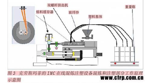 克勞斯瑪菲公司開發(fā)的在線配混注塑成型設(shè)備(其工作原理如圖3所示)為LFT工藝的實(shí)現(xiàn)提供了一種新的方法。該設(shè)備將雙螺桿混煉機(jī)和克勞斯瑪菲的標(biāo)準(zhǔn)MC塑料注塑機(jī)組合,實(shí)現(xiàn)了原料在線直接混煉。這種混煉-注塑方法具有更多優(yōu)勢: