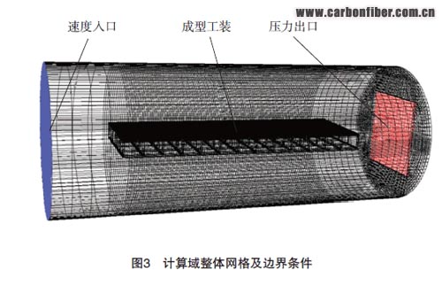 由經(jīng)驗(yàn)和工藝試驗(yàn)可知工裝的變形均在毫米量級,工裝的尺寸在幾米至十幾米,工裝結(jié)構(gòu)變形不會對熱壓罐內(nèi)的氣體流動產(chǎn)生明顯影響。由于流體計(jì)算對網(wǎng)格要求較高,文中使用專業(yè)流體仿真軟件FLUENT進(jìn)行工裝及熱壓罐內(nèi)整個(gè)流場的網(wǎng)格劃分,如圖3所示。對工裝建立的有限元模型既可以適用于溫度場的計(jì)算,也可以用于工裝的結(jié)構(gòu)變形計(jì)算。熱壓罐工藝規(guī)范簡化如圖4所示,溫度場計(jì)算所用相關(guān)材料參數(shù)如表1所示。