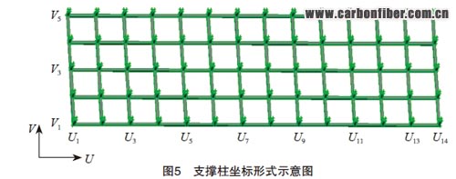 對復(fù)合材料固化工裝而言,工裝型面的變形將直接影響與其接觸的復(fù)合材料制件的成型質(zhì)量,垂直型面方向的翹曲變形將直接影響到大尺寸復(fù)合材料成型的曲率精度,所以型面變形場的表征方法應(yīng)該與型面的變形直接相關(guān)。為對成型工裝的型面變形量進(jìn)行表征,所用支撐柱如圖5所示。