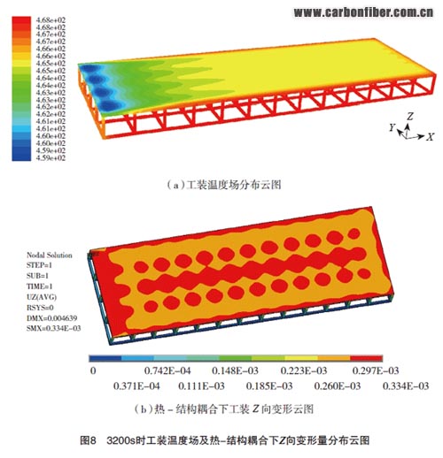 在復(fù)合材料的熱壓罐固化過程中,對柱支撐形式的固化工裝型面,溫度不均勻性導(dǎo)致的型面翹曲變形較為復(fù)雜。在工裝結(jié)構(gòu)內(nèi)部,支撐柱存在位置所對應(yīng)型面的局部變形量大于沒有支撐柱存在的位置,這是因?yàn)橹沃鶎諝獾臄_流作用加快了支撐柱與周圍空氣之間的熱傳遞。圖8為3200s時(shí)工裝溫度場及Z向結(jié)構(gòu)變形量分布云圖。