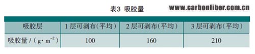 大型復(fù)合材料壁板因為厚度變化大,所以各個區(qū)域余膠量分布不均,在制件制備過程中則要通過預(yù)吸膠環(huán)節(jié)控制各個區(qū)域厚度在標(biāo)準(zhǔn)范圍之內(nèi),這就要求我們對預(yù)吸膠工藝進(jìn)一步掌握。吸膠材料和吸膠時間是對吸膠量的關(guān)鍵影響因素,如表3和圖3所示。