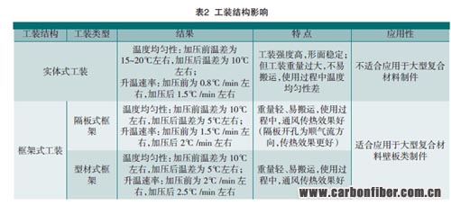 不同結(jié)構(gòu)形式的工裝,結(jié)合復(fù)合材料零件的實際制造情況,對復(fù)合材料的成型工藝過程會產(chǎn)生不同的影響,尤其是對復(fù)合材料零件固化過程中的加熱效率以及溫度均勻性的影響。具體情況如表2所示。