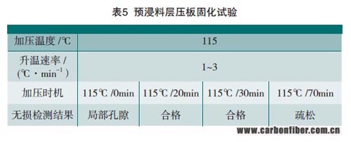 加壓點包括加壓溫度、加壓時機。加壓點的選擇, 首先是加壓溫度,加壓溫度過低則樹脂流動性不好,纖維不易均勻浸潤易造成缺陷;加壓溫度過高,樹脂聚合速率過快不易掌握加壓時機。其次在確定加壓溫度的前提下把握好加壓時機,加壓時機過早則樹脂粘度低,排出樹脂過多造成零件貧膠、孔隙率高;加壓時機過晚則樹脂聚合程度高,流動性差制件易夾雜氣泡產(chǎn)生疏松、分層等缺陷。加壓點的最佳選擇為樹脂由粘流態(tài)向高彈態(tài)轉(zhuǎn)變過程中的過渡區(qū)間。這和升溫速率、加壓溫度、加壓時機都密切相關(guān),不同的溫度—時間曲線有著不同的加壓點。目前經(jīng)常采用差熱分析儀和流變儀來了解樹脂的固化反應(yīng)過程和粘度變化過程,實際生產(chǎn)中也有用滑板法或拉絲法測定凝膠時間來了解樹脂在溫度—時間曲線各個點的粘度情況,如表4、表5所示。