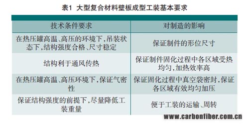 工裝是復(fù)合材料制件的成型基礎(chǔ),工裝既要保證復(fù)合材料制件的形位尺寸,同時又要充分適應(yīng)復(fù)合材料制件的成型工藝特點——傳熱、傳壓等,所以工裝技術(shù)是復(fù)合材料研制的關(guān)鍵因素,復(fù)材成型工裝基本要求如表1所示。