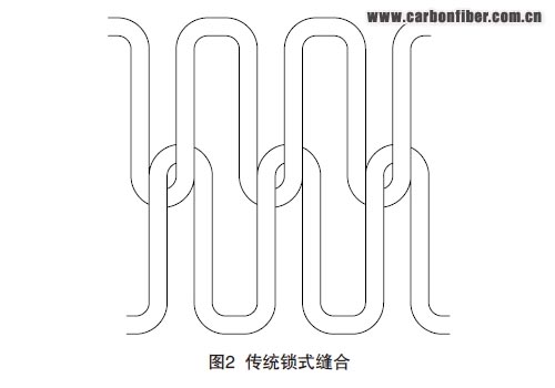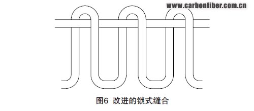(1)鎖式縫合(改進(jìn)鎖式縫合)。因其工藝性較好在復(fù)合材料預(yù)制體研制中得到廣泛使用。傳統(tǒng)鎖式縫合方式較常見,其特點(diǎn)是縫線和底線的結(jié)點(diǎn)在制件厚度的中間位置,這對于復(fù)合材料來說,結(jié)點(diǎn)處的應(yīng)力集中很大程度上會影響復(fù)合材料性能的提高。因此,在傳統(tǒng)鎖式縫合的基礎(chǔ)上進(jìn)行工藝優(yōu)化,出現(xiàn)了改進(jìn)鎖式縫合,圖6即為改進(jìn)的鎖式縫合。在復(fù)合材料縫合中,改進(jìn)鎖式縫合應(yīng)用較多,使用此縫合方式制件在厚度方向縫合線彎曲少,對面內(nèi)纖維的損傷少,由縫合引起的應(yīng)力集中也較小,因此使復(fù)合材料具有相對更高的損傷容限。 內(nèi)容來自123456