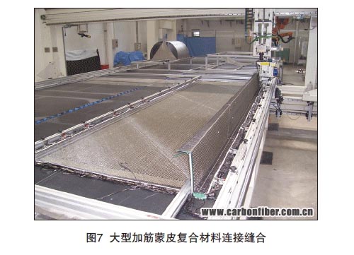 鎖式縫合因其受雙面縫合的工作原理所限,對預(yù)成型體的縫合工作只能在縫合設(shè)備工作平臺上完成,所以通常此種縫合方式只適用于曲率相對較小的預(yù)制體上,縫合厚度可達(dá)20mm。鎖式縫合對縫線的張力可做相應(yīng)調(diào)節(jié),因此在沒有特殊定位要求的情況采用鎖式縫合無需對預(yù)制體使用定位膠粘劑。通過調(diào)節(jié)鎖縫,復(fù)合材料加強(qiáng)筋與蒙皮連接的結(jié)構(gòu)應(yīng)用鎖式縫合較多,在靠近立筋的縫合區(qū)需要更換小壓腳來保證縫針靠近加強(qiáng)筋根部從而完成縫合。圖7為應(yīng)用鎖式縫合對復(fù)合材料大型加筋蒙皮的連接縫合。